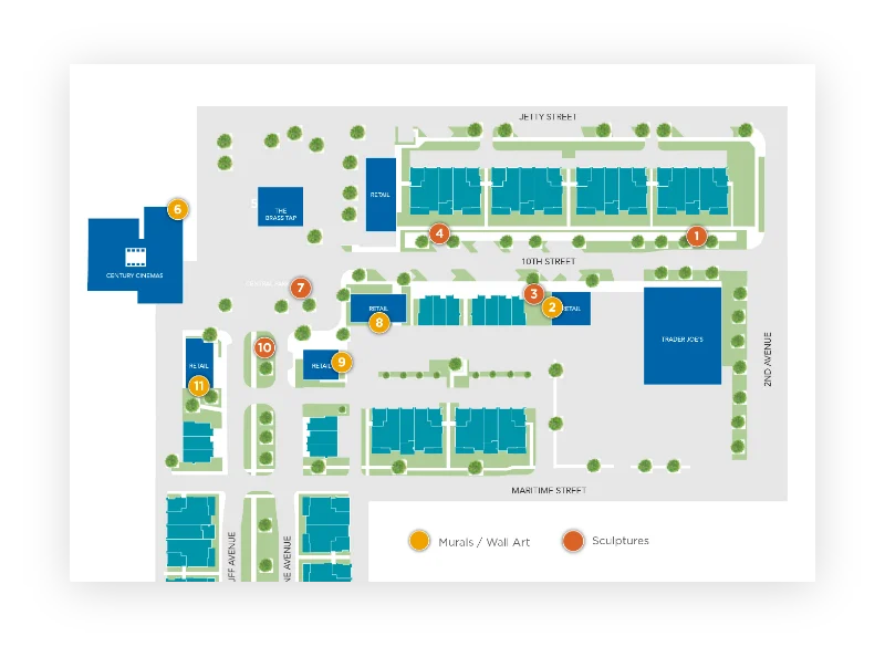 Promenade at The Dunes is the heart of a contemporay coastal village anchored by a movie theater and Central Park at one end, and a specialty grocer at the other. In between, visitors discover a series of sculptures, mosaics, murals and graphic art installations brought together to communicate the coastal narrative, connecting the natural environment and this area with its military history.